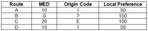 A routing table contains multiple BGP routes to the same destination prefix. The route preference is the same for each route.