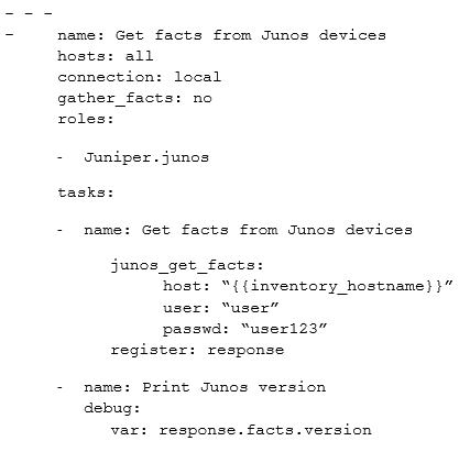 The Ansible playbook shown in the exhibit is executed against a set of Junos network devices. Each Junos device is configured with a user account in the super-user login class. The user account uses SSH-key-based authentication with a passphrase of user123.