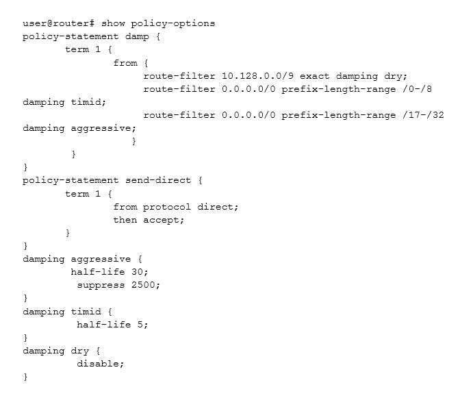 A customer is concerned that the route damping policy on routes with prefixes greater than/17 is allowing too many flaps to occur. The customer does not want to change the default timer.