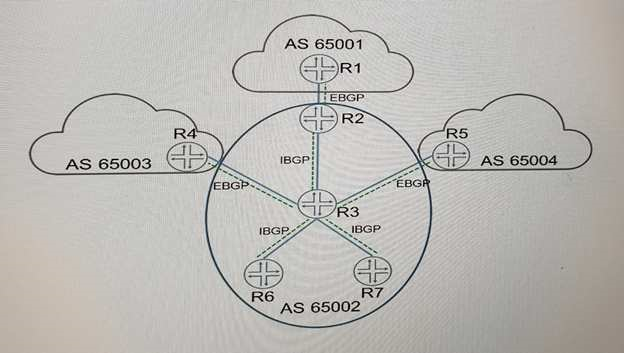 Router1, in peer AS 65001, advertises routes to R2 using EBGP. R2 advertises the routes learned from R1 to R3 using IBGP. R3 is configured as a route reflector with routers R6 and R7 as clients.