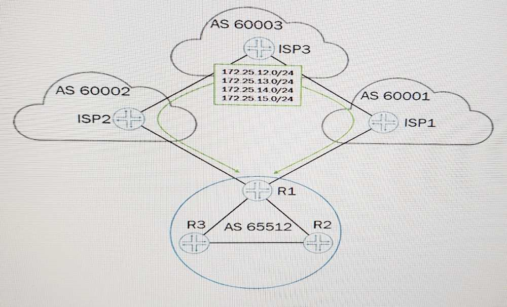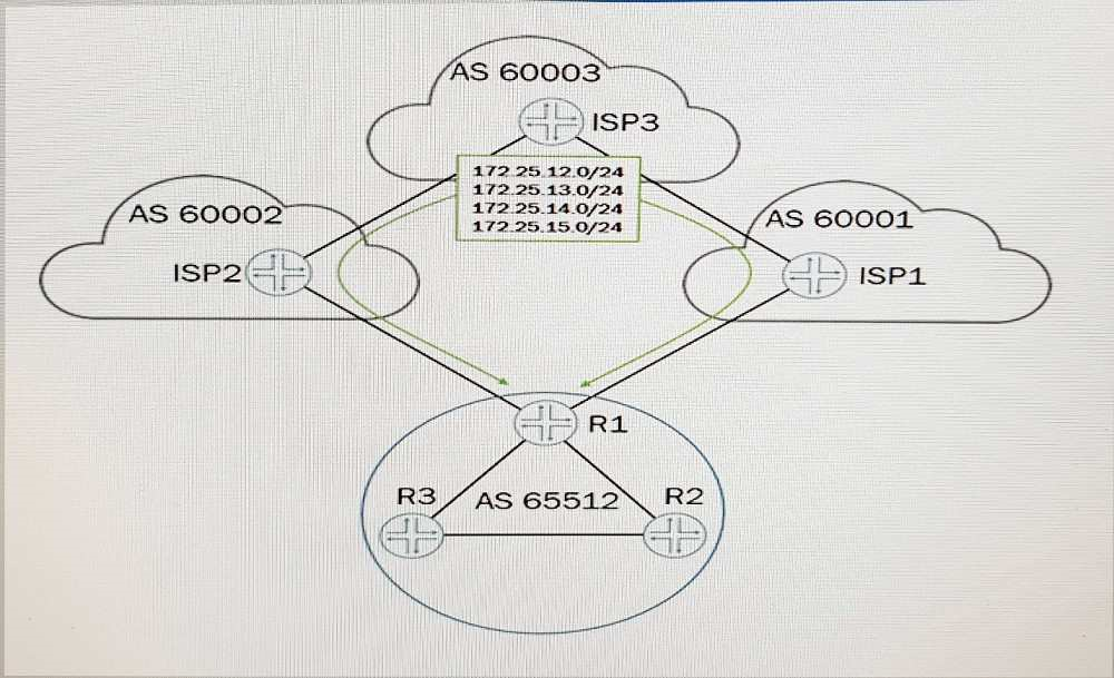 Referring to the exhibit, you have EBGP peerings with both ISP1 and ISP2. You are receiving the 172.25.12.0/24, 172.25.13.0/24, 172.25.14.0/24, and 172.25.15.0/24 routes through both neighbors. You must ensure that traffic to these prefixes are load balances through both service providers. You have configured a load-balancing policy and have applied it to the forwarding table, but the prefixes are not being load balanced.