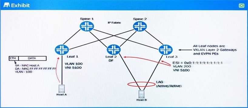 Referring to the exhibit, each leaf node is a QFX5100 acting as a VXLAN Layer 2 Gateway using EVPN signaling. Leaf 2 and Leaf 3 are both attached to the same EVPN Ethernet segment. Leaf 2 has been elected the designated forwarder for VLAN 200 on that Ethernet segment.