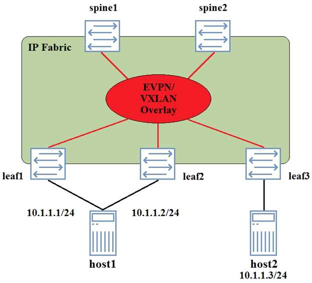 An EVPN-signaled VXLAN overlay has been deployed in the network shown in the exhibit. Host1 is a bare metal server, and is dual-homed to the network. The IP addresses 10.1.1.1/24 and 10.1.1.2/24 are assigned to the same physical NIC, and no virtualization is configured on the server.