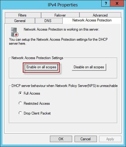 On the Network Access Protection tab, under Network Access Protection Settings, choose Enable for this scope, verify that Use default Network Access Protection profile is selected, and then click OK.