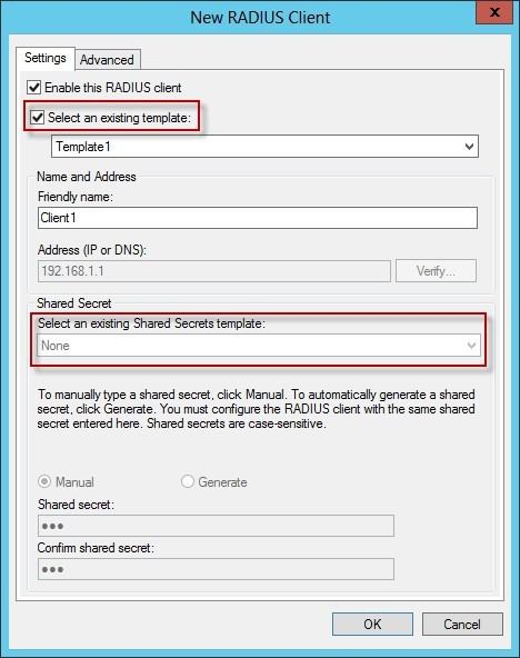 Clear checkmark for Select an existing template in the new client wizard. In New RADIUS Client, in Shared secret, do one of the following:Bullet Ensure that Manual is selected, and then in Shared secret, type the strong password that is also entered on the RADIUS client. Retype the shared secret in Confirm shared secret.