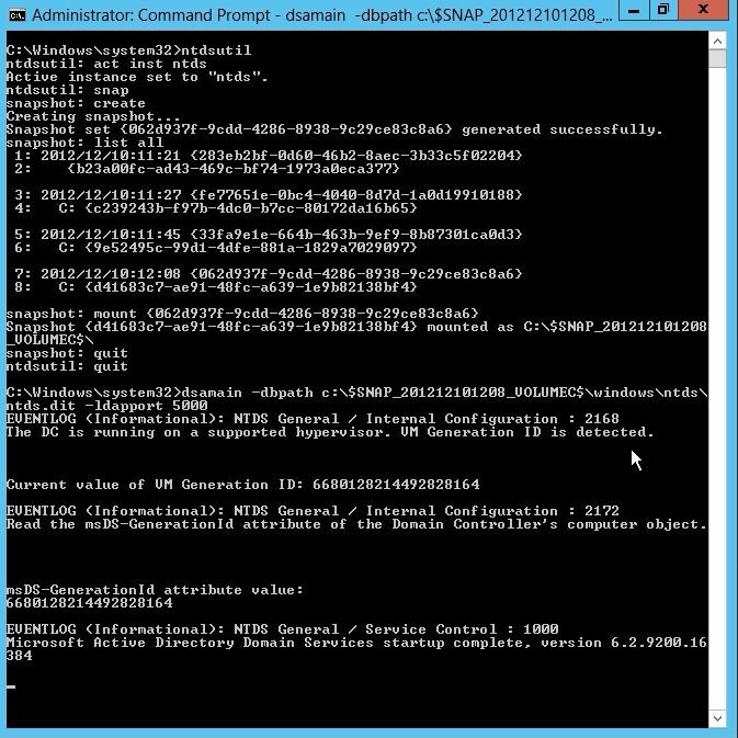 4. From a command prompt, run dsamain.exe -dbpath c:\$snap_201204131056_volumec$\windows\ntds\ntds.dit -1dapport 33389.