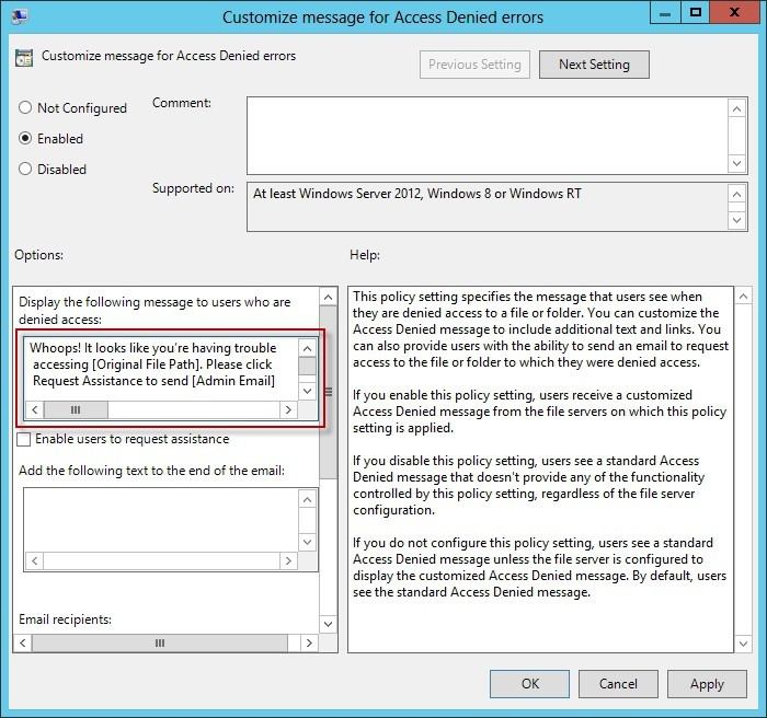 The Customize message for Access Denied errors policy, shown in the screenshot below, enables us to create the actual message box shown to users when they access a shared file to which their user account has no access.