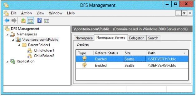 The domain contains a domain-based Distributed File System (DFS) namespace that is configured as shown in the exhibit.