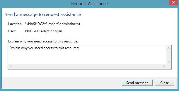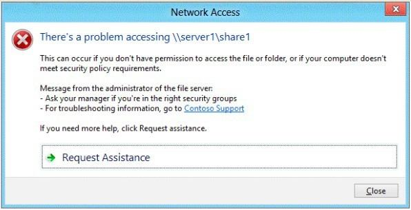Access-Denied Assistance is a new role service of the File Server role in Windows Server 2012.   We need to install the prerequisites for Access-Denied Assistance. Because Access-Denied Assistance relies up on e-mail notifications, we also need to configure each relevant file server with a Simple Mail Transfer Protocol (SMTP) server address. Let's do that quickly with Windows PowerShell:Set-FSRMSetting -SMTPServer mailserver. nuggetlab.com -AdminEmailAddress [email protected] -FromEmailAddress [email protected] You can enable Access-Denied Assistance either on a per-server basis or centrally via Group Policy. To my mind, the latter approach is infinitely preferable from an administration standpoint. Create a new GPO and make sure to target the GPO at your file servers' Active Directory computer accounts as well as those of your AD client computers. In the Group Policy Object Editor, we are looking for the following path to configure Access-Denied Assistance:\Computer Configuration\Policies\Administrative Templates\System\Access-Denied Assistance   The Customize message for Access Denied errors policy, shown in the screenshot below, enables us to create the actual message box shown to users when they access a shared file to which their user account has no access.   What's cool about this policy is that we can "personalize" the e-mail notifications to give us administrators (and, optionally, file owners) the details they need to resolve the permissions issue quickly and easily. For instance, we can insert pre-defined macros to swap in the full path to the target file, the administrator e-mail address, and so forth. See this example:Whoops! It looks like you're having trouble accessing [Original File Path]. Please click Request Assistance to send [Admin Email] a help request e-mail message. Thanks! You should find that your users prefer these human-readable, informative error messages to the cryptic, non-descript error dialogs they are accustomed to dealing with. The Enable access-denied assistance on client for all file types policy should be enabled to force client computers to participate in Access-Denied Assistance. Again, you must make sure to target your GPO scope accordingly to "hit" your domain workstations as well as your Windows Server 2012 file servers. Testing the configuration This should come as no surprise to you, but Access-Denied Assistance works only with Windows Server 2012 and Windows 8 computers. More specifically, you must enable the Desktop Experience feature on your servers to see Access-Denied Assistance messages on server computers. When a Windows 8 client computer attempts to open a file to which the user has no access, the custom Access-Denied Assistance message should appear:  If the user clicks Request Assistance in the Network Access dialog box, they see a secondary message:  At the end of this process, the administrator(s) will receive an e-mail message that contains the key information they need in order to resolve the access problem:The user's Active Directory identity The full path to the problematic file A user-generated explanation of the problem So that's it, friends! Access-Denied Assistance presents Windows systems administrators with an easy-to-manage method for more efficiently resolving user access problems on shared file system resources. Of course, the key caveat is that your file servers must run Windows Server 2012 and your client devices must run Windows 8, but other than that, this is a great technology that should save admins extra work and end-users extra headaches. Reference: http://4sysops.com/archives/access-denied-assistance-in-windows-server-2012/