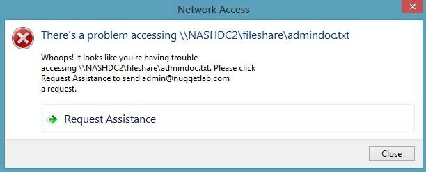 When a Windows 8 client computer attempts to open a file to which the user has no access, the custom Access-Denied Assistance message should appear: