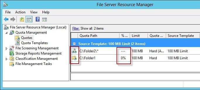 In Quota Management, click the Quota Templates node. In the Results pane, select the template on which you will base your new quota. Right-click the template and click Create Quota from Template (or select Create Quota from Template from the Actions pane). This opens the Create Quota dialog box with the summary properties of the quota template displayed. Under Quota path, type or browse to the folder that the quota will apply to. Click the Create quota on path option. Note that the quota properties will apply to the entire folder. Note: To create an auto apply quota, click the Auto apply template and create quotas on existing and new subfolders option. For more information about auto apply quotas, see Create an Auto Apply Quota.Under Drive properties from this quota template, the template you used in step 2 to create your new quota is preselected (or you can select another template from the list). Note that the template's properties are displayed under Summary of quota properties. Click Create. Create a new Quota on path, without using the auto apply template and create quota on existing and new subfolders.       Reference: http://technet.microsoft.com/en-us/library/cc755603(v=ws.10).aspx