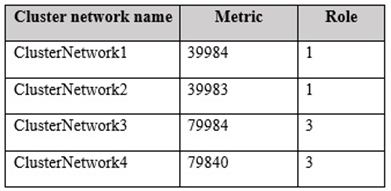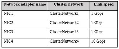 You have a Windows Server 2012 R2 failover cluster that contains four nodes. Each node has four network adapters. The network adapters on each node are configured as shown in the following table.