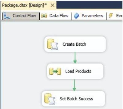 You are building a SQL Server Integration Services (SSIS) package to load product data sourced from a SQL Azure database to a data warehouse. Before the product data is loaded, you create a batch record by using an Execute SQL task named Create Batch. After successfully loading the product data, you use another Execute SQL task named Set Batch Success to mark the batch as successful.