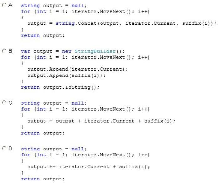 A String object concatenation operation always creates a new object from the existing string and the new data. A StringBuilder object maintains a buffer to accommodate the concatenation of new data. New data is appended to the buffer if room is available; otherwise, a new, larger buffer is allocated, data from the original buffer is copied to the new buffer, and the new data is then appended to the new buffer. The performance of a concatenation operation for a String or StringBuilder object depends on the frequency of memory allocations. A String concatenation operation always allocates memory, whereas a StringBuilder concatenation operation allocates memory only if the StringBuilder object buffer is too small to accommodate the new data. Use the String class if you are concatenating a fixed number of String objects. In that case, the compiler may even combine individual concatenation operations into a single operation. Use a StringBuilder object if you are concatenating an arbitrary number of strings; for example, if you're using a loop to concatenate a random number of strings of user input. References: http://msdn.microsoft.com/en-us/library/system.text.stringbuilder(v=vs.110).aspx
