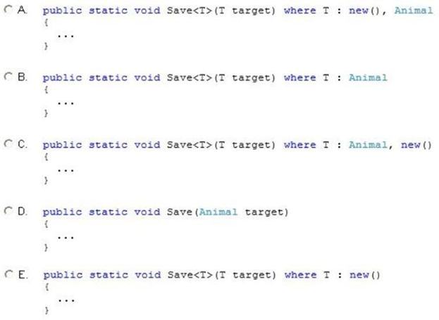 The Save() method must be strongly typed. It must allow only types inherited from the Animal class that uses a constructor that accepts no parameters.