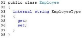 You are creating a class named Employee. The class exposes a string property named EmployeeType. The following code segment defines the Employee class. (Line numbers are included for reference only.)
