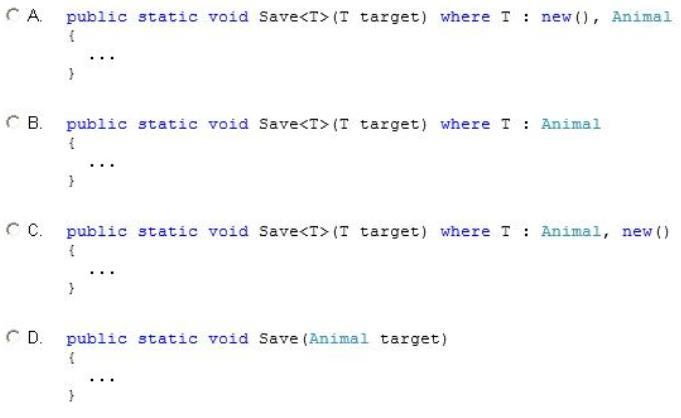 The Save() method must be strongly typed. It must allow only types inherited from the Animal class that uses a constructor that accepts no parameters.
