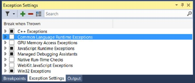 Note: The possible exceptions that could break from this list is determined by the runtime you are debugging. For example, if you are using managed-only debugging then the debugger will never break for C++, Win32 Exceptions, etc. even if they are configured to break when thrown.
