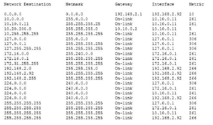 You have a server named Server1 that runs Windows Server 2016. Server1 has the following routing table.