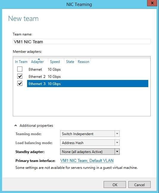 4. From the properties of the NIC team on VM1, add the adapter named Ethernet to the NIC team.