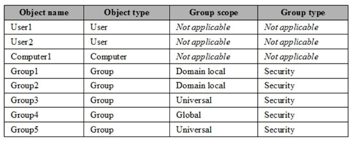 The contoso.com forest contains the objects configured as shown in the following table.