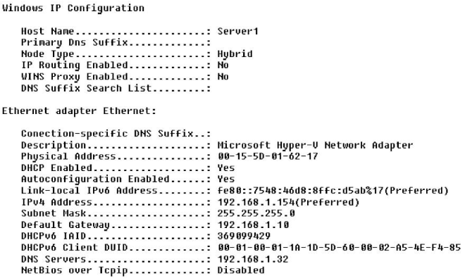 Before installing one of the nodes, you run the ipconfig /all command and receive the following output.