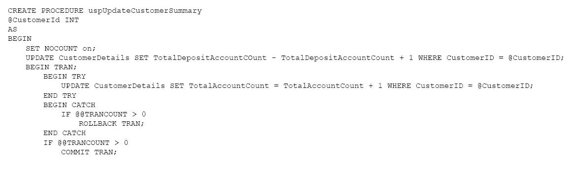 You have the following stored procedures: spDeleteCustAcctRelationship and spUpdateCustomerSummary. The spUpdateCustomerSummary stored procedure was created by running the following Transacr-SQL statement: