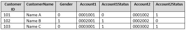 1. Split the table into three separate tables. Include the AccountNumber and CustomerID columns in the first table. Include the CustomerName and Gender columns in the second table. Include the AccountStatus column in the third table.