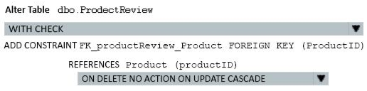 B: We should use WITH NOCHECK asexisting records in the ProductReview table must not be validated with the Product table.C: Deletes should not be allowed, so we use ON DELETE NO ACTION.Updates should be allowed, so we use ON DELETE NO CASCADE NO ACTION: the Database Engine raises an error,and the update action on the row in the parent table is rolled back.CASCADE: corresponding rows are updated in the referencing table when that row is updated in the parent table.Note: ON DELETE { NO ACTION | CASCADE | SET NULL | SET DEFAULT }Specifieswhat action happens to rows in the table that is altered, if those rows have a referential relationship and the referenced row is deleted from the parent table. The default is NO ACTION. ON UPDATE { NO ACTION | CASCADE | SET NULL | SET DEFAULT } Specifieswhat action happens to rows in the table altered when those rows have a referential relationship and the referenced row is updated in the parent table. The default is NO ACTION. Note: You must modify the ProductReview Table to meet the following requirements:The table must reference the ProductID column in the Product table Existing records in the ProductReview table must not be validated with the Product table. Deleting records in the Product table must not be allowed if records are referencedby the ProductReview table. Changes to records in the Product table must propagate to the ProductReview table. References:https://msdn.microsoft.com/en-us/library/ms190273.aspxhttps://msdn.microsoft.com/en-us/library/ms188066.aspx