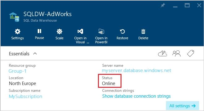1. Open the Azure portal and open your database. Notice that the Status is Online.