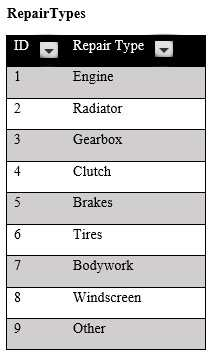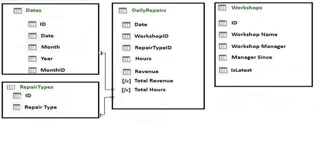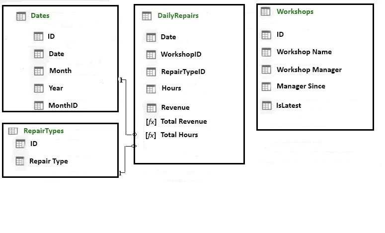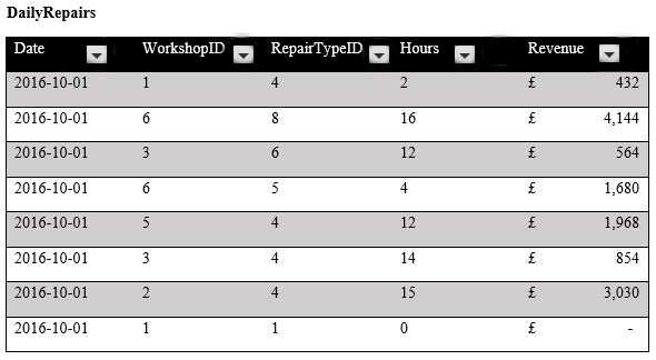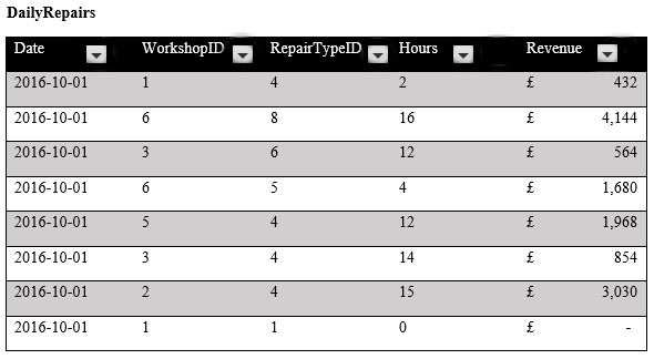• DailyRepairs has a log of hours and revenue for each day, workshop, and repair type. Every day, a log entry is created for each workshop, even if no hours or revenue are recorded for that day. Total Hours and Total Revenue column.