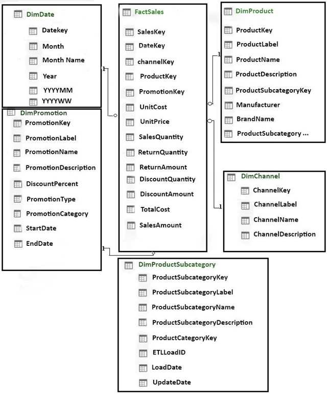 You have six workbook queries that each extracts a table from a Microsoft Azure SQL database. The tables are loaded to the data model, but the data is not loaded to any worksheets. The data model is shown in the Data Model exhibit. (Click the Exhibit button.)