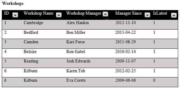 • Workshops have a list of all the workshops and the current and previous workshop managers. The format of the Workshop Manager column is always Firstname Lastname. A value of 1 in the IsLatest column indicates that the workshop manager listed in the record is the current workshop manager.
