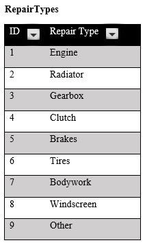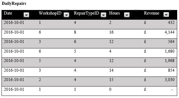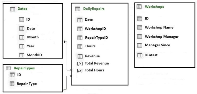 • DailyRepairs has a log of hours and revenue for each day, workshop, and repair type. Every day, a log entry is created for each workshop, even if no hours or revenue are recorded for that day. Total Hours and Total Revenue are two measures defined in DailyRepairs. Total Hours sums the Hours column, and Total Revenue sums the Revenue column.