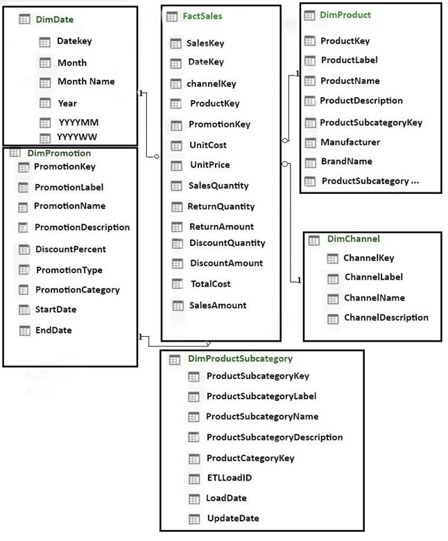 You have six workbook queries that each extracts a table from a Microsoft Azure SQL database. The tables are loaded to the data model, but the data is not loaded to any worksheets. The data model is shown in the Data Model exhibit.