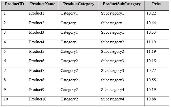Solution: You create a hierarchy named Products that contains ProductCategory, ProductSubCategory, and ProductName. You add a PivotTable. You drag Products to the Rows field. You drag Price to the Values field.