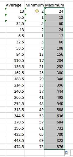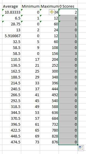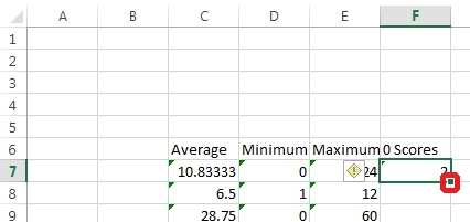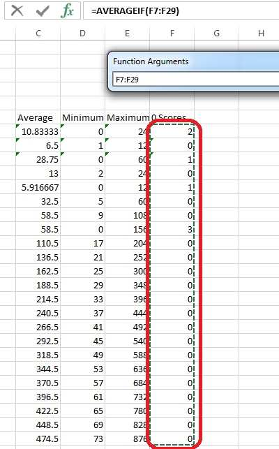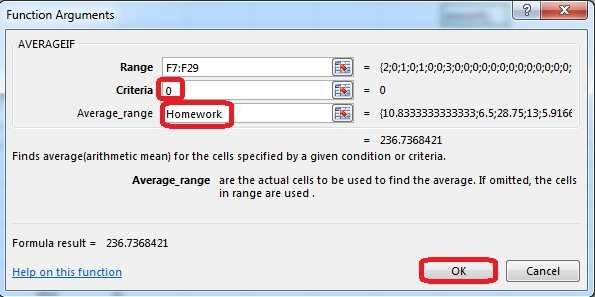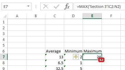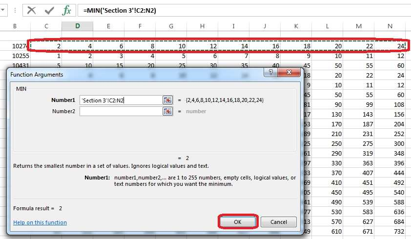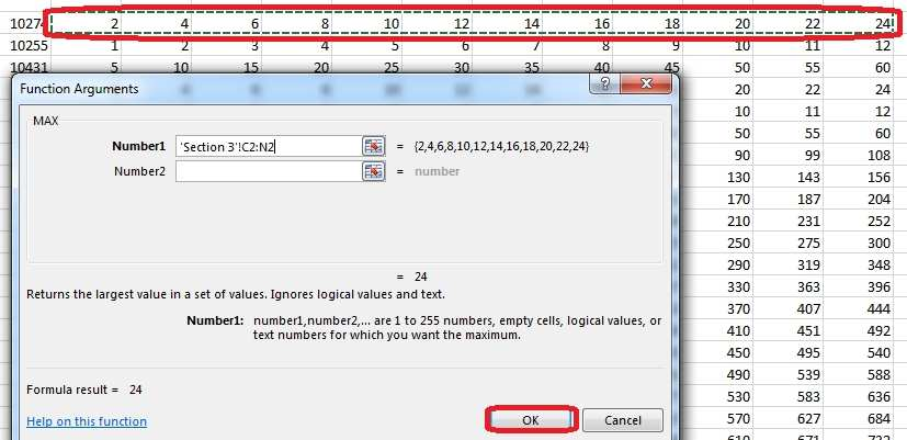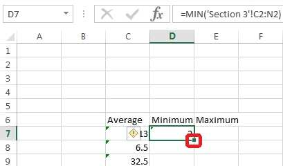 Step 1: Click cell D7, and the click the Insert Function Button. Step 2: In the Insert Function dialog box select Category Statistical, select function MAX, and click OK.Formula. Find the minimum homework score for each student. Step 1: Click cell D7, and the click the Insert Function Button. Step 2: In the Insert Function dialog box select Category Statistical, select function MIN, and click OK. The function Arguments Dialog box appears:Step 3: Click on the Section 3 tab (left bottom part of the window). Step 4: Locate the data for the first student. This well be cell range C2 to N2. Click C2 and then Shift-click cell N2. Then click the OK button. Step 5: Copy cell D7 downwards until cell D29. Result will be like: