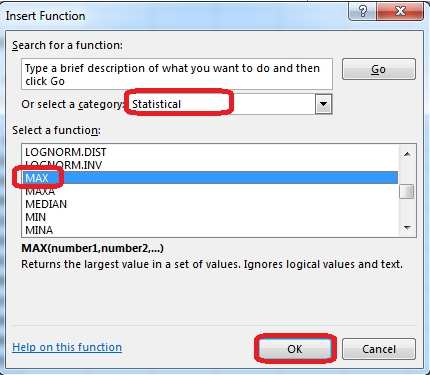 Step 2: In the Insert Function dialog box select Category Statistical, select function MAX, and click OK.