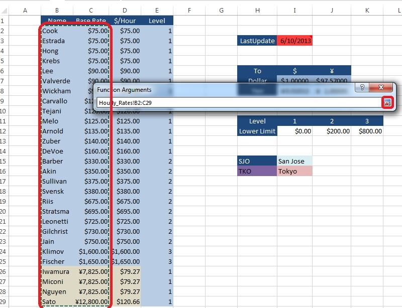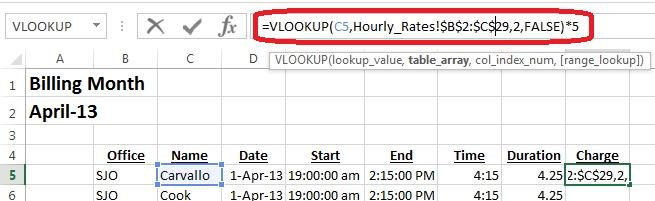 Step 2: In the Functions arguments dialog box, for Lookup Value click cell C5, for Table_Array switch to Hourly_rates worksheet click Cell B2, shift-click cell C29.