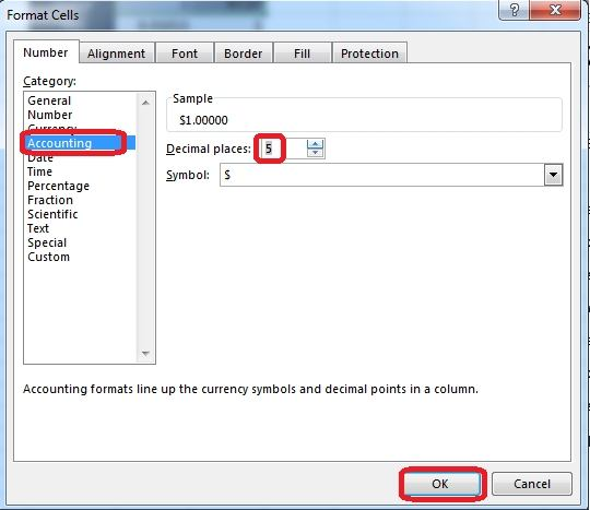 Step 2: In the Format Cells dialog box select Category Accounting, change Decimal places to: 5, and click OK.