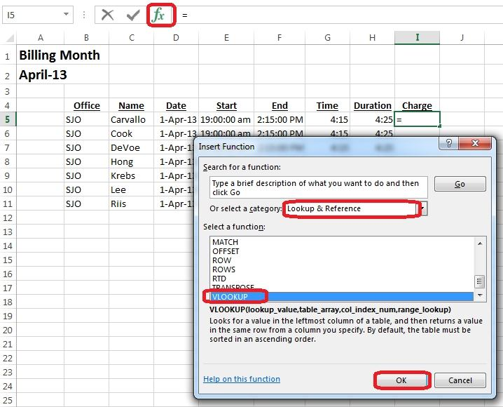 Step 1: Click cell I5, click the Insert Function button, select category Lookup & Reference, select VLOOKUP, and click OK.