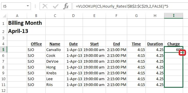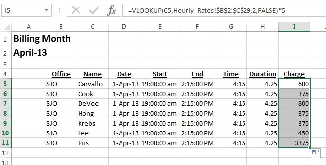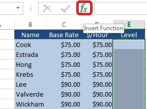 Step 1: Click cell I5, click the Insert Function button, select category Lookup & Reference, select VLOOKUP, and click OK.  Step 2: In the Functions arguments dialog box, for Lookup Value click cell C5, for Table_Array switch to Hourly_rates worksheet click Cell B2, shift-click cell C29.  Step 3: For Col_index_num type 2, for Range_lookup select FALSE, and click OK.  Step 4: Edit the Formula by typing *5 in the formula box, and change the B2 and C29 references to absolute references by clicking them and using the F4 key.  Step 5: Copy the formula in cell I5 downward to cell I299.  Will look like: