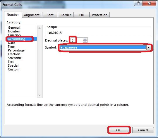 Step 4: In the Format Cells dialog box select Category Accounting, change Decimal places to: 5, set Symbol to: ¥ Japanese, and click OK.