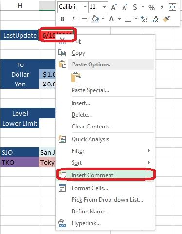 Step 1: Right-Click in cell I3, and select Insert comment from the context menu.  Step 2: Type: If red fill is present, update exchange rates  Step 3: Click cell I3.You can test by hover above cell I3: