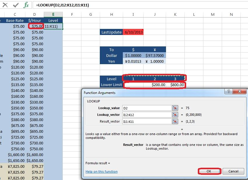 Step 4: For Lookup_value click cell D2, for Lookup_vector select cells I12:K12, for Result vector cells I11:K11, and click the OK button.