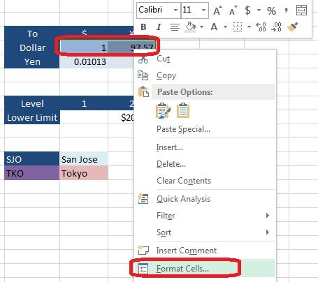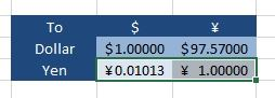 Step 1: Click cell I7, Shift-click cell J7, right-click in this area, and from the context menu select Format Cells.  Step 2: In the Format Cells dialog box select Category Accounting, change Decimal places to: 5, and click OK.  Step 3: Click cell I8, shift-click cell J8, right-click in this area, and from the context menu select Format Cells.Step 4: In the Format Cells dialog box select Category Accounting, change Decimal places to: 5, set Symbol to: ¥ Japanese, and click OK.  Result will be like: