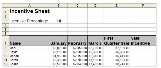 In order to accomplish the task, you will have to insert the following formula:=$B$3/100 * E8 According to the question, the formula will be inserted in cell F8 and then the cell's border will be dragged to the F12 cell. Furthermore, the incentive percentage is fixed for all sales managers and the value is provided in the cell B3. You will have to insert a formula that refers to the B3 cell as an absolute reference. For this you will have to type currency symbol ($) before the row name and column number. In order to accomplish the task, type the following formula in the cell F8:=$B$3/100 * E8 When absolute reference is used for referencing a cell in a formula, dragging cell's border to another cell does not change the cell's reference. Answer options B and E are incorrect. This formula references the B3 cell as a relative reference. After inserting the formula, when the cell's border is dragged, it will change the cell reference relatively. Answer options A and C are incorrect. Ampersand symbol (&) is not used for referencing cells in Excel.