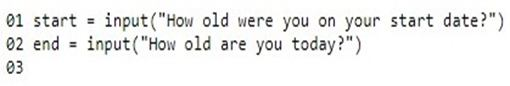 4. print(“Congratulations on” + str(end - start)) + “years of service!”