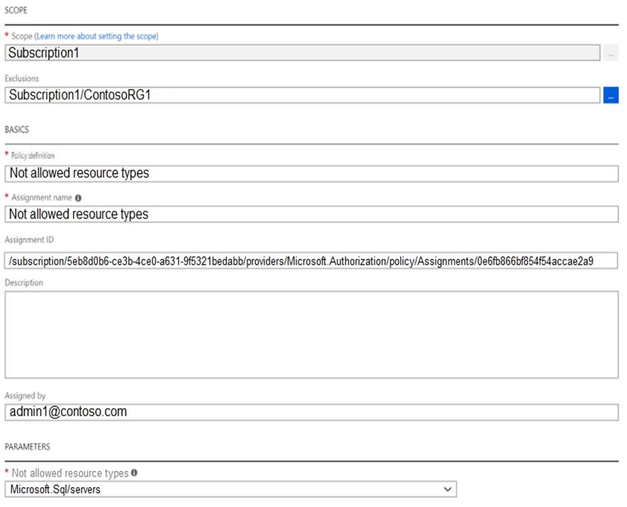 You are prevented from creating Azure SQL servers anywhere in Subscription 1 with the exception of ContosoRG1