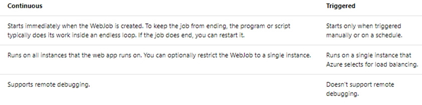 The following table describes the differences between continuous and triggered WebJobs.